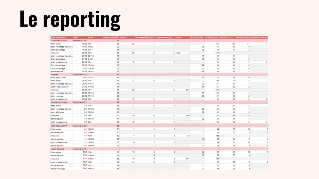 Pour finir, nous avons utilisé un tableau Excel pour pouvoir faire du reporting avec toutes les données présentes sur le compte Instagram. Nous avons pu observer l’évolution du nombre d’abonnés comme le nombre d’ouverture, d’impression ou d’interaction de chaque post.