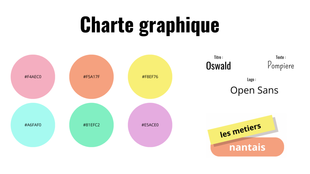 Nous avons ensuite établi une charte graphique comportant les couleurs, les typographies ainsi que le logo :