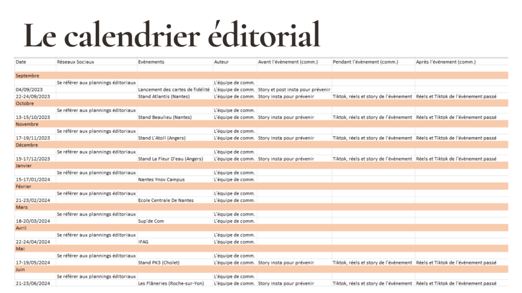Pour finir ce projet, nous avons réalisé un calendrier éditorial en complément des plannings éditoriaux de chaque réseau social pour permettre une meilleure organisation.